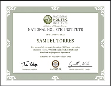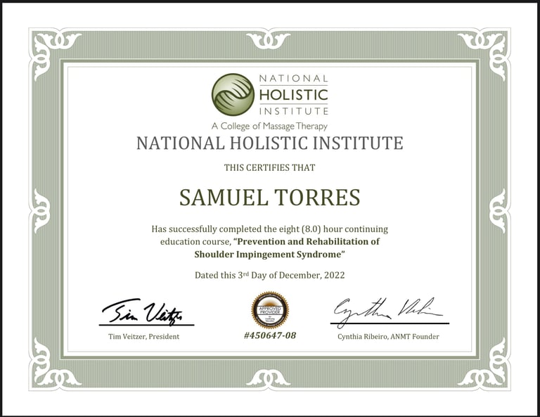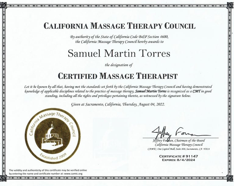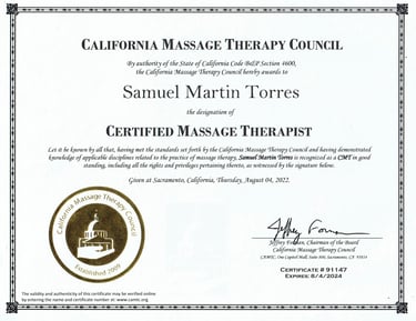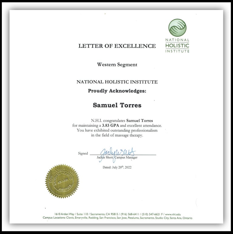 My name is Samuel Torres and I'm a Neuromuscular Massage Therapist with hundreds of hours of training , years of experiance and a Graduate of National Holistic Institute in Sacramento. I'm trained in Neuromuscular Massage Therapy, Deep Tissue Massage, Myofacial Therapies, Sports Massage (I've even had the privilege of working with Sacramento Republic FC) I strive to learn more about massage and its benefits each and everyday: knowing that there is always room for improvement motivates me to look for ways to serve my clients in better ways.